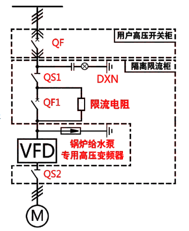 希望森蘭為鍋爐電動給水泵拖動系統(tǒng)電動機配置的是給水泵專用變頻調(diào)速系統(tǒng)。系統(tǒng)針對鍋爐給水泵運行的特點和要求設計,完全符合鍋爐給水泵的運行特點。系統(tǒng)一次主回路方案選取一拖一帶限流柜方案,滿足系統(tǒng)穩(wěn)定運行要求的同時消除了高壓上電時對系統(tǒng)的沖擊。