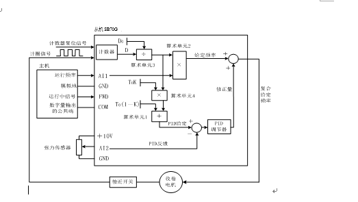 系統控制結構如下圖所示:將主機(四缸或壓光變頻器)的運行頻率作為從機(壓光機或卷取變頻器)的主給定頻率,張力控制PID調節器的輸出對主給定頻率進行修正,使反饋張力與給定張力無偏差。將張力傳感器的輸出信號作為PID反饋,PID給定通過數字設定成理想的張力值。主機的運行中信號作為從機的起停命令。
