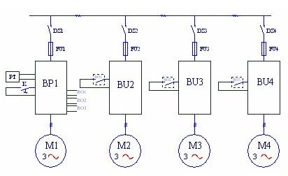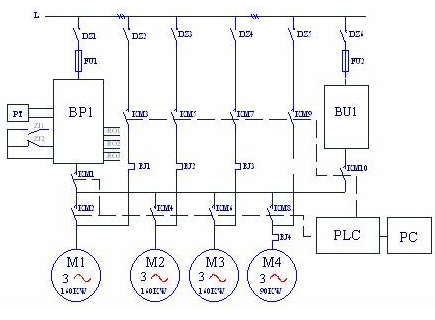 圖中:BP1—變頻器;BU2~BU4--軟起動器,PT—壓力變送器。由圖一可見,變頻器連接在第一臺水泵電機上,需要加泵或減泵時,由變頻器RO1~RO3端口輸出信號起動或停止其他的水泵,這時水泵的起動采用自耦降壓起動裝置或軟起動器。這種方案的特點是水泵電機不需要在變頻和工頻之間切換;第一臺水泵永遠連接在變頻器上,沒有切換過程中的失壓現象;由于變頻泵以外的泵都有軟起動器,所以不需要再做備用系統,當變頻器故障時,可用軟起動器手動起動M2~M4水泵,保證供水不致中斷;每臺電機都有起動器,初始投資較大。另一種是“循環投切”方案,系統圖如圖二所示