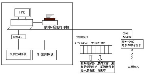 為保證系統的可靠性,上位機PC用于管理,用組態軟件做出若干工藝流程圖,實時顯示系統的運行狀況,并統計歷史數據,如需要可隨時打印報表;還用于故障的報警和處理。PC機為研華工業計算機,PLC為西門子S-7300,便于與總控室計算機聯網,采用帶有PROFIBUS接口的CPU315。CP5611是通信模塊,PDM-820AC電參數綜合分析儀用于檢測系統的用電量。控制水泵的起/停,切換,閥的啟/閉;電機電流,溫度的檢測,水泵使用時間的統計;壓力,流量,水質參數的采集等,均由PLC完成。水壓的給定值由變頻器鍵盤設定。