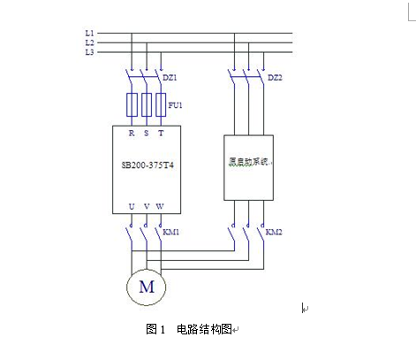 在原電機(jī)與開關(guān)之間增加一套變頻裝置,并保留了原有工頻回路做旁路,其電路結(jié)構(gòu)圖如圖1所示。