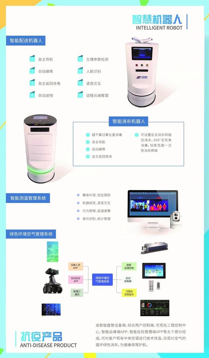 機器人產品是解決方案中最具智能化的高科技產品,憑借集團長期的智能制造技術沉淀,推出智慧測溫機器人、智慧巡檢防疫機器人、智慧配送機器人等系列,還可實現與空調N95的AI智能聯動。