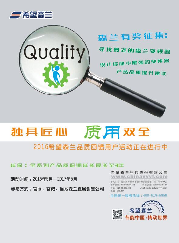 作為國內變頻器行業領軍企業的希望森蘭科技股份有限公司(以下簡稱“希望森蘭”),在今年的5月份重磅推出了主題為“獨具匠心,質用雙全”的品質提升回饋活動,目前活動正在火熱進行中。