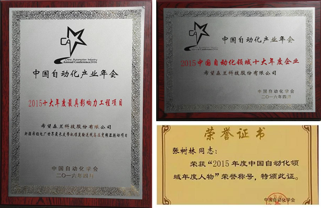 在2015中國自動化領域年度獎項評選現場,希望森蘭科技股份有限公司獲得“2015中國自動化領域十大年度企業”,公司副總經理張樹林先生榮獲“2015中國自動化領域年度人物”,此外,希望森蘭的“新疆希鋁電廠世界最長皮帶機煤炭輸送線高壓變頻器驅動項目”獲得“2015中國自動化領域十大年度最具影響力工程項目” 三項重要大獎。
